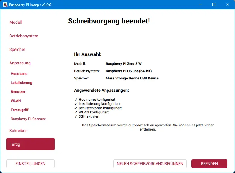 Du kannst nun den Raspberry Pi Imager beenden und deine microSD-Karte aus dem PC entfernen.