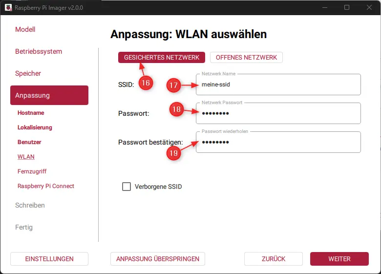 Gib hier bitte deine Zugangsdaten ein und kontrolliere diese Eingaben lieber einmal zu viel als zu wenig. Wenn du hier einen Fehler machst, kann sich dein Raspberry Pi Zero 2 W nicht mit deinem Netzwerk verbinden und du kannst später nicht per SSH darauf zugreifen!